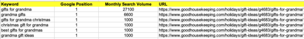 I don’t love using the same word twice in a page title, but it works here. As the table below shows, the URL https://www.goodhousekeeping.com/holidays/gift-ideas/g4683/gifts-for-grandma/ ranks in the No. 1 position for “gifts for grandma,” “grandma gifts,” “gifts for grandma christmas,” “christmas gift for grandma,” “best gifts for grandma,” and “grandma gift ideas.”