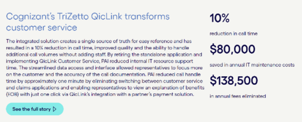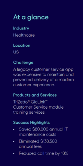 Though they don’t label it “business outcomes” in the web version of the case study, they clearly detail the impact in the descriptive concluding text and break out the all-important numbers – 10% reduction in call time, $80,000 saved in annual IT maintenance costs, $138,500 in annual fees eliminated.