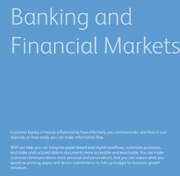 After this introduction, it shares eight case studies in a simple format that highlights points readers most likely want to know – the challenge, solution, and results. Xerox explains the solutions from the perspective of the client with no mention of its product names. For example, among the bullets in the solution category: “A single provider with dedicated operators to centrally manage the digitalisation (scanning and indexing) and onward distribution of incoming mail.”